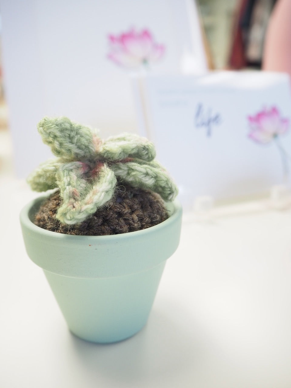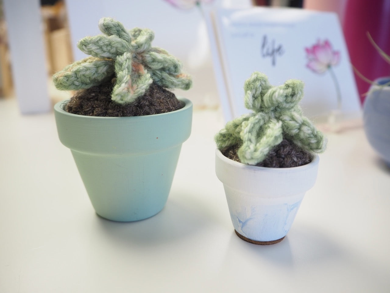 They are made by a local artist: C Yarn Hut is run by local artist Clara, based in Vancouver. She has a huge passion for knitting and crocheting and picks up her needles and a ball of yarn, any spare moment she has. They don't need watering! If you or anyone you know isn't so great with keeping plants healthy, than these are a perfect choice :)
