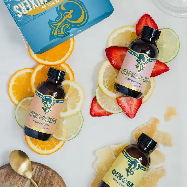 This collection is Portland Syrups' best sellers in a 3.4oz size and includes: Authentic Ginger, Strawberry Lemon Lime and Citrus Passion!