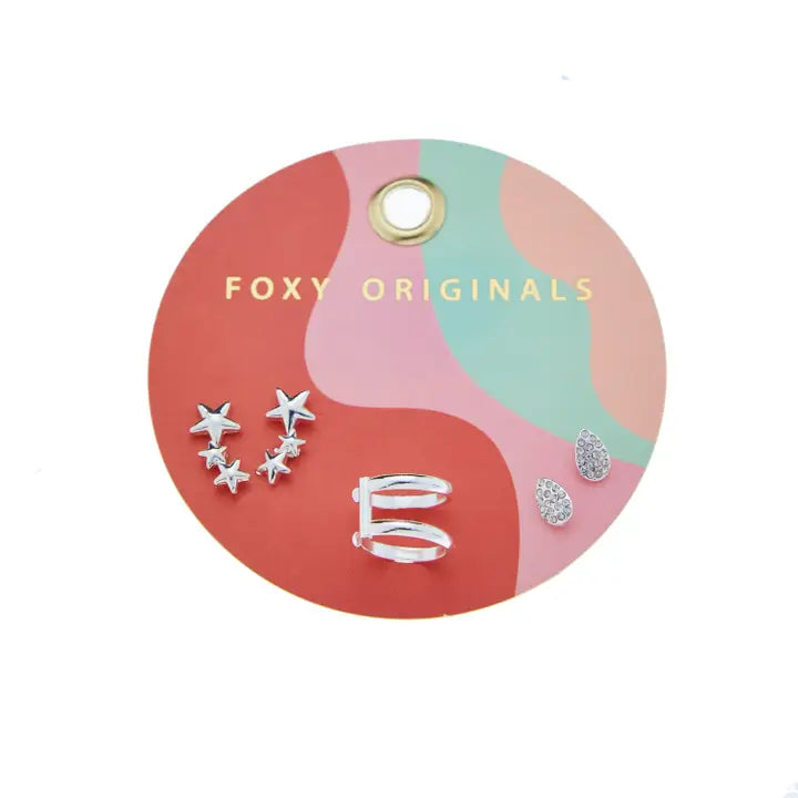 This cute carded set of earrings contains one pair of star cluster studs, one pair of pave studs, and one ear cuff. Mix and match your pieces to create any number of combinations!