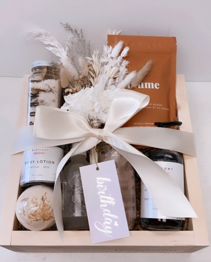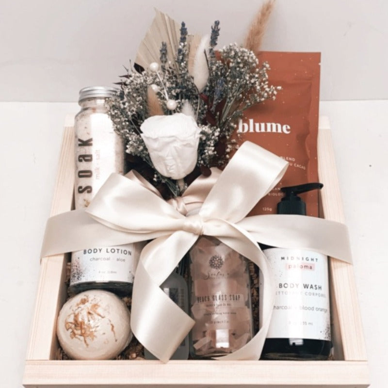 Featuring a large dried floral arrangement, it really is all about the blooms! Floral scented self-care products are also included for the full pampering in blooms experience. Imagine that flower petal bath, this crate has that and so much more!