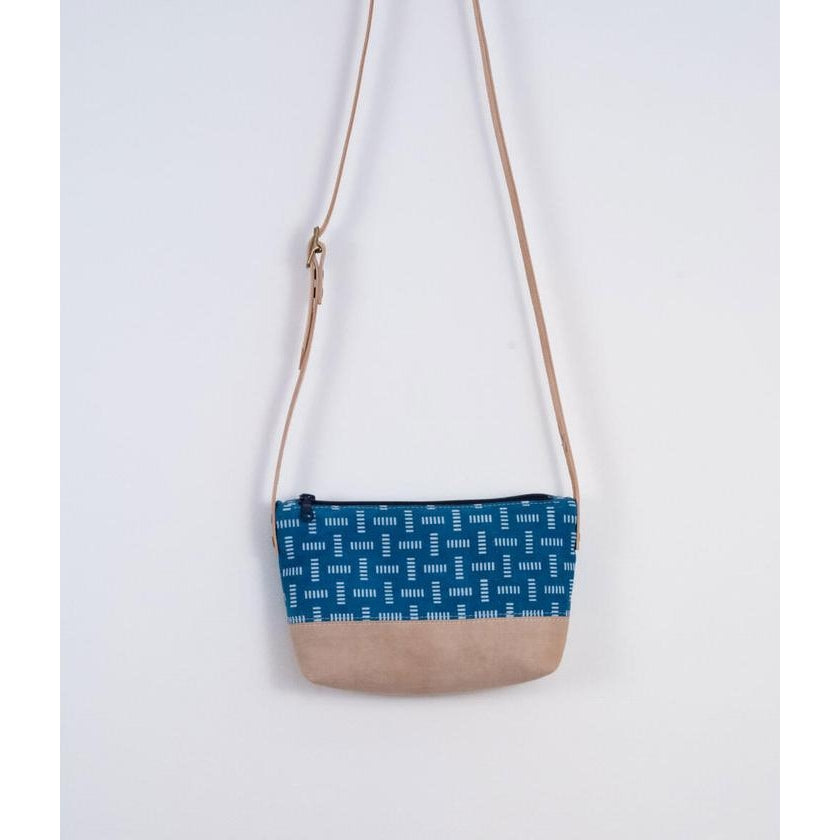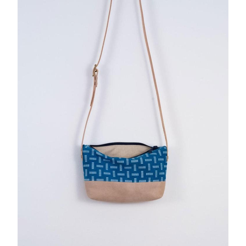 The outer fabric is a medium weight 100% organic cotton canvas. The top boasts a hand-dyed pattern in natural indigo created using a traditional rice paste technique called Katazome, while the bottom is solid, dyed with natural Black Walnut. The vegetable-tanned leather strap will last for years to come and will continue to soften and develop a beautiful patina as it ages.