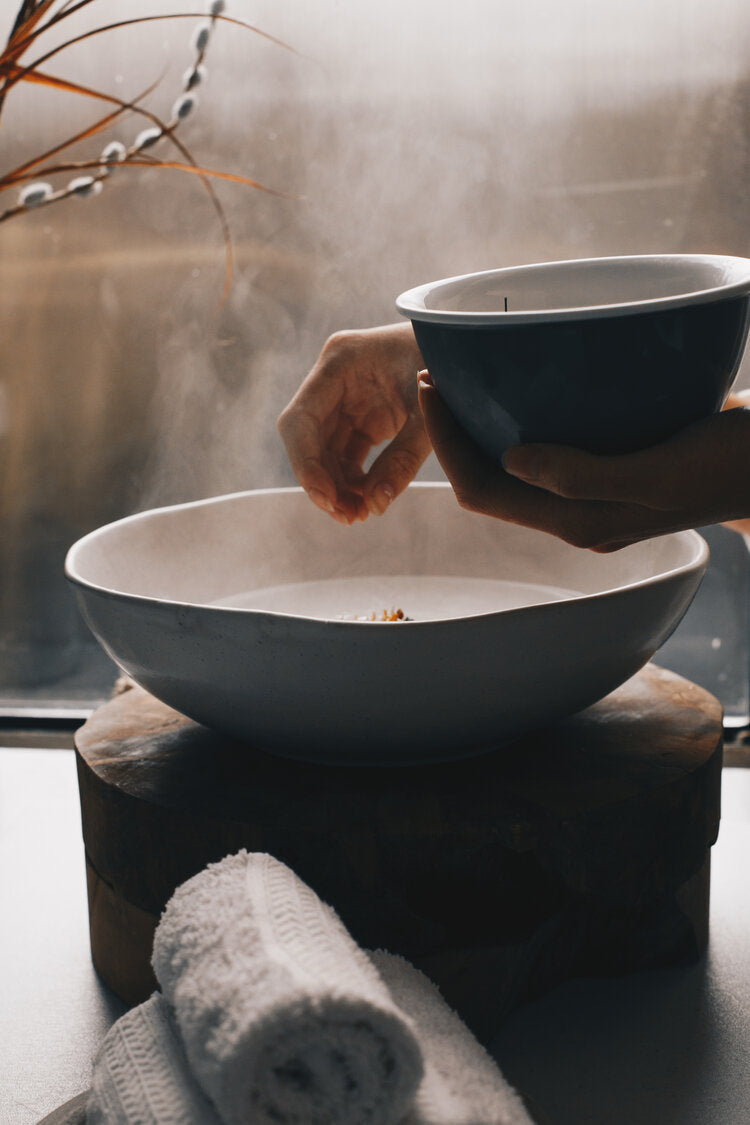 Two tablespoons to a bowl of boiling water. Reduce the heat to a simmer. Lean face about two inches over the bowl and drape a towel over your head to trap the steam. Enjoy for 5-10 minutes. Immediately rinse lukewarm water, gently pat dry, and apply a moisturizing cream or one of Sealuxe’s facial oils to maximize moisture.