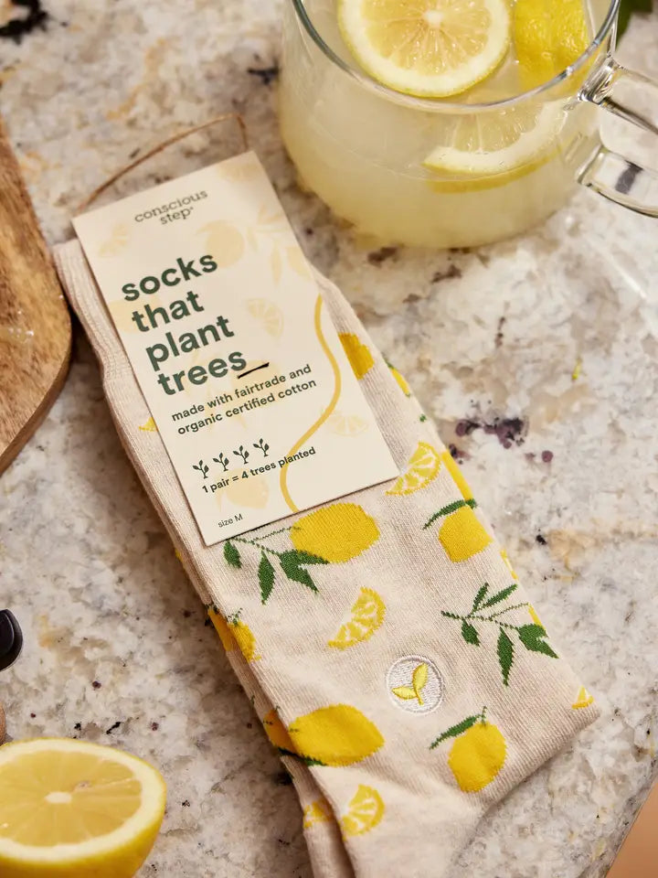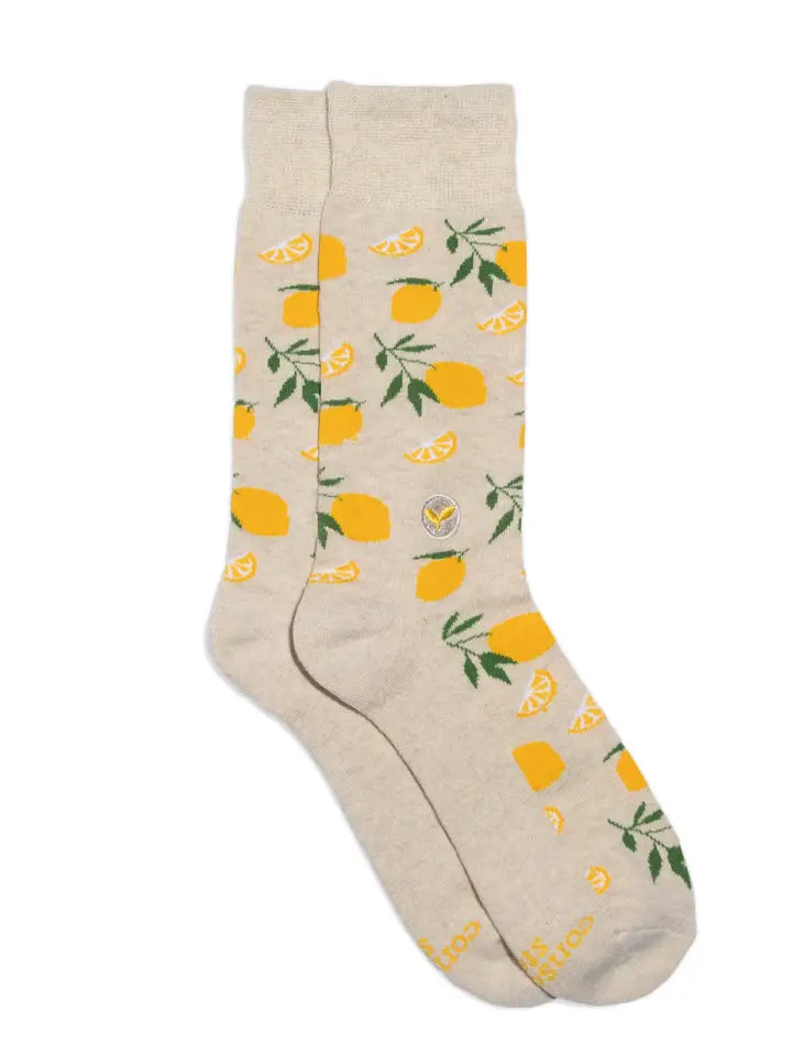 When life gives you lemons, grab this pair of lemon socks! Squeeze the day in this soft beige, lemon and leaf-decorated pair.