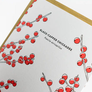 Part of the Stationery Bird Series, this Chickadee greeting card is perfect to give to bird loving friends or family for any occasion. Beautifully letterpress printed, this card showcases an intricately detailed Chickadee on red berries.