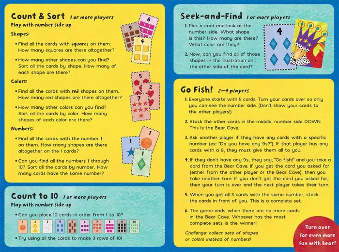 Get ready to play and learn with Bear! For 20 years, Bear has delighted children as Barefoot Books’ most beloved character — and now, children can practice early math, storytelling and taking turns with Bear as their guide! Created by an early childhood expert as part of the new Barefoot Books First Games series, these 30 double-sided cards and five games will provide new challenges as children grow.