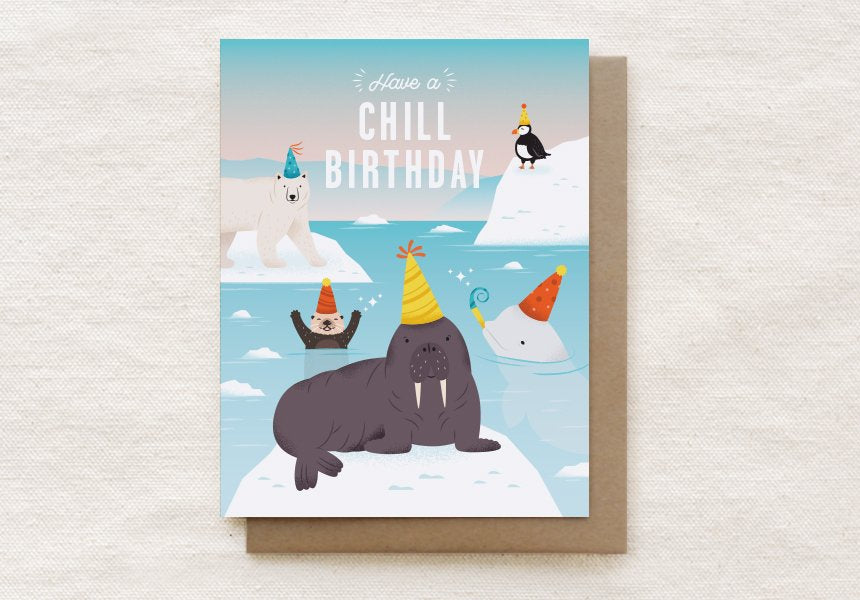 This Chill Birthday Card is the perfect way to wish someone a happy birthday! It features a charming birthday scene with a walrus and friends ready to help celebrate the special day in the coolest way!