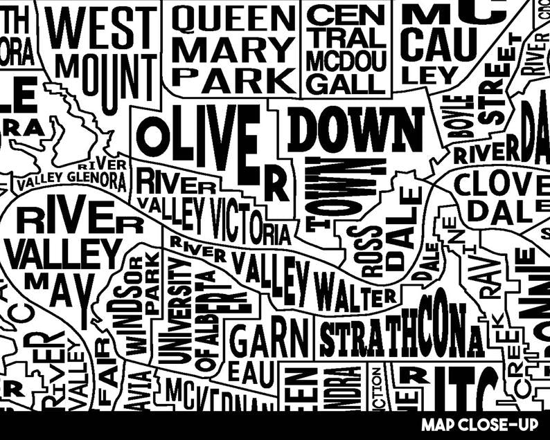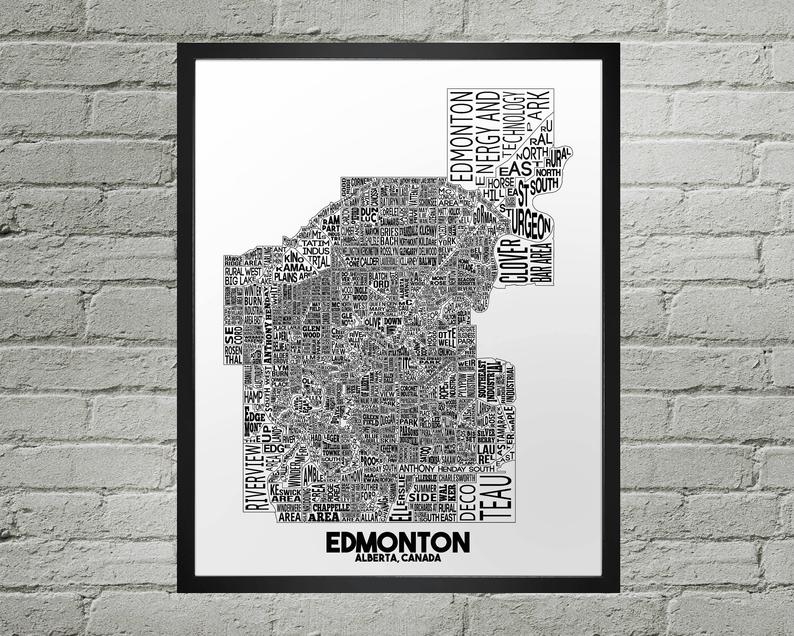 Edmonton typography city map print comprised of all city neighbourhoods in its actual location.