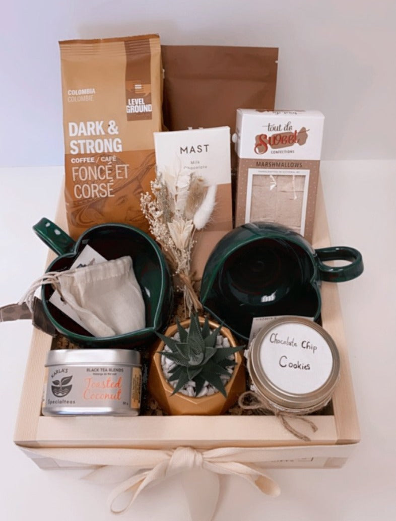The two person option includes a bigger crate, more treats and second handmade ceramic mug. There is also a Large version where coffee and a plant is added as well.