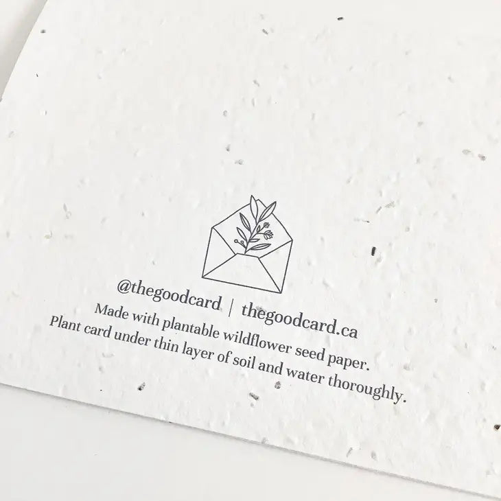 The Good Cards plantable seed paper cards are made from bio-degradable, post-consumer waste meaning no new trees are harmed. Each card is full of a blend of 6 different wildflower seeds, that are all tested for purity, non-GMO, and non-invasive. All cards are printed with non-toxic ink and are left blank inside for your message.