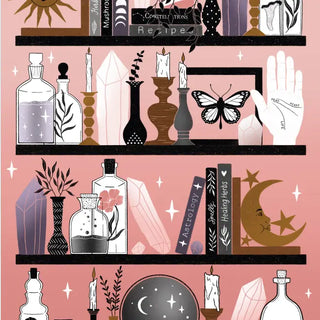 Calling all your witchy, spiritual, and crystal collecting customers. Beautifully-illustrated mystic bookshelf featuring bound books, tarot, crystals and mushrooms.