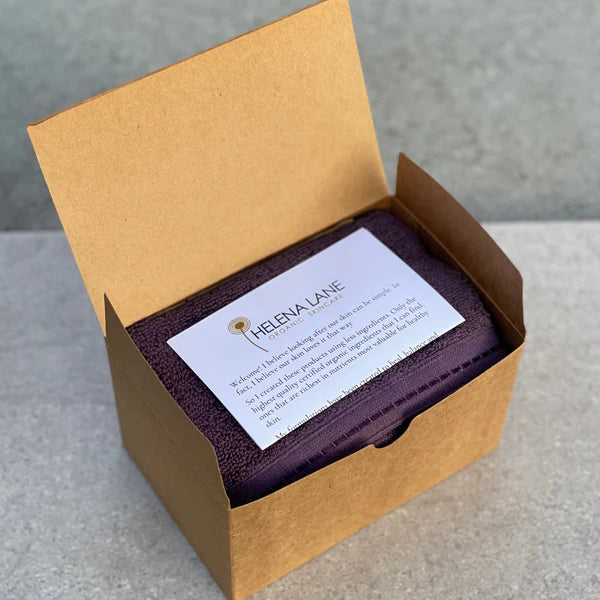 - Packaged in a recycled card gift box with an organic cotton face cloth