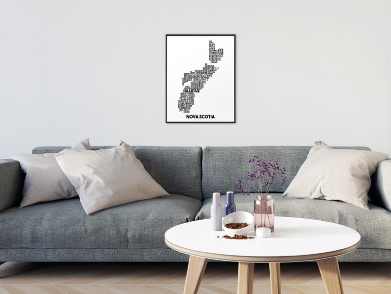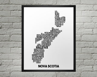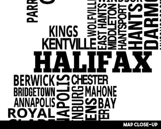 Nova Scotia cities map print comprised of all incorporated cities placed in their relative location.