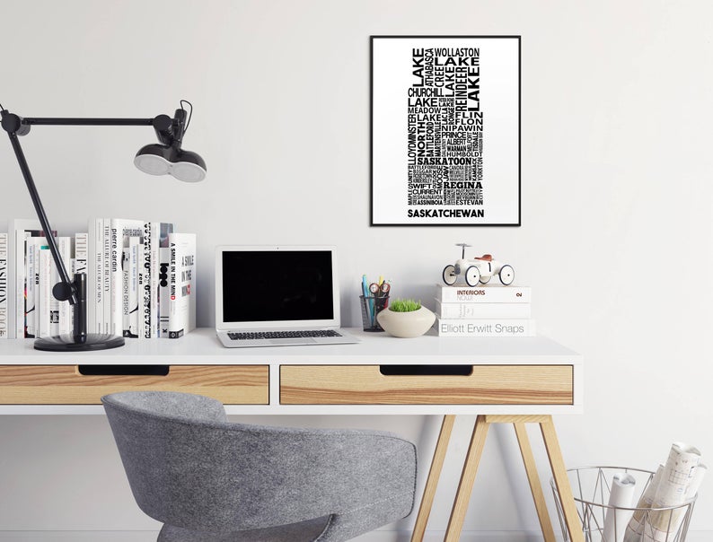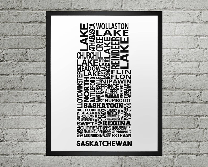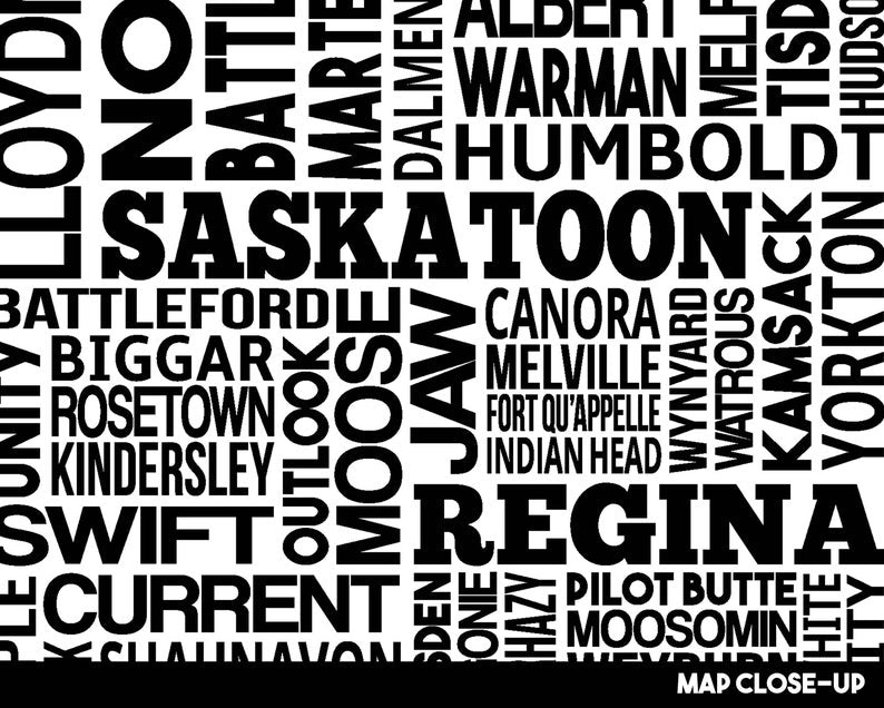 Saskatchewan cities map print comprised of all incorporated cities placed in their relative location.