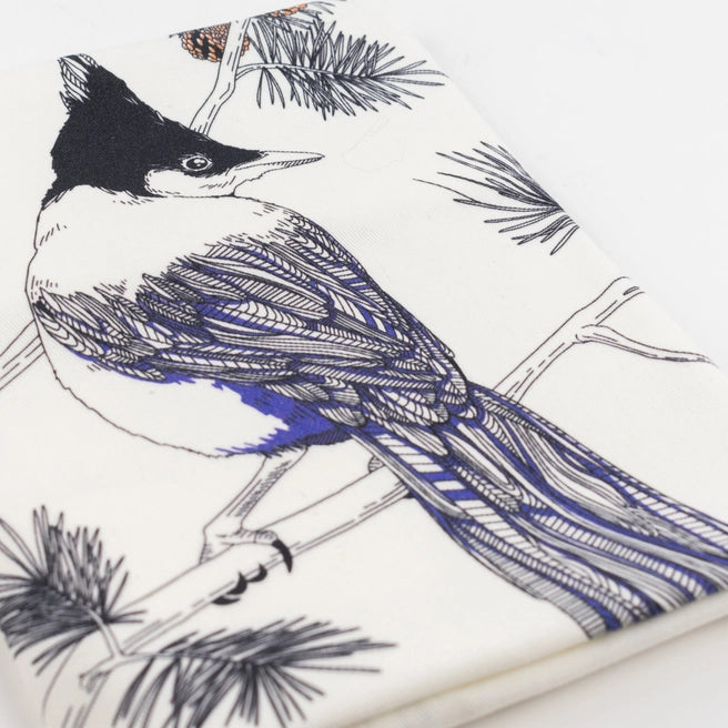 This tea towel showcases an intricately detailed Stellar Jay illustration. The towels are 100% organic cotton, and are designed and printed with water based inks locally in Vancouver, BC Canada.