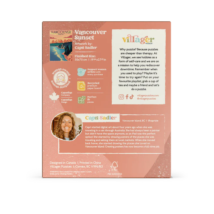 Enjoy sunset on the Stanley Park seawall - free from all the tourists, bikes, and scooters. Beautifully-illustrated travel poster puzzle of the Vancouver skyline at sunset. Designed by Vancouver Island artist Capri Sadler.